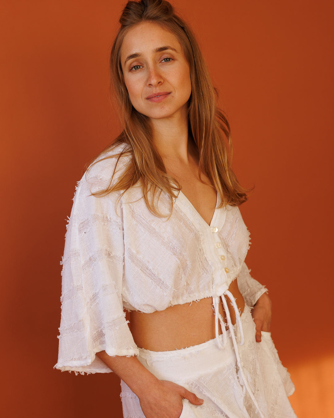 טופ כפתורים + פרנזים עם חרוזים: טופ קרופ שמביא איתו טקסטורה, תנועה ואופי — ויסקוז רך עם טקסטורת “פרנזים” עדינה, כפתורים מקדימה, ושרוך התאמה במותן שסוגר את זה בול על הגוף. בקצה השרוך יש פרנזים בעלי 2 שכבות וחרוזים שמעניקים מראה יוקרתי.
