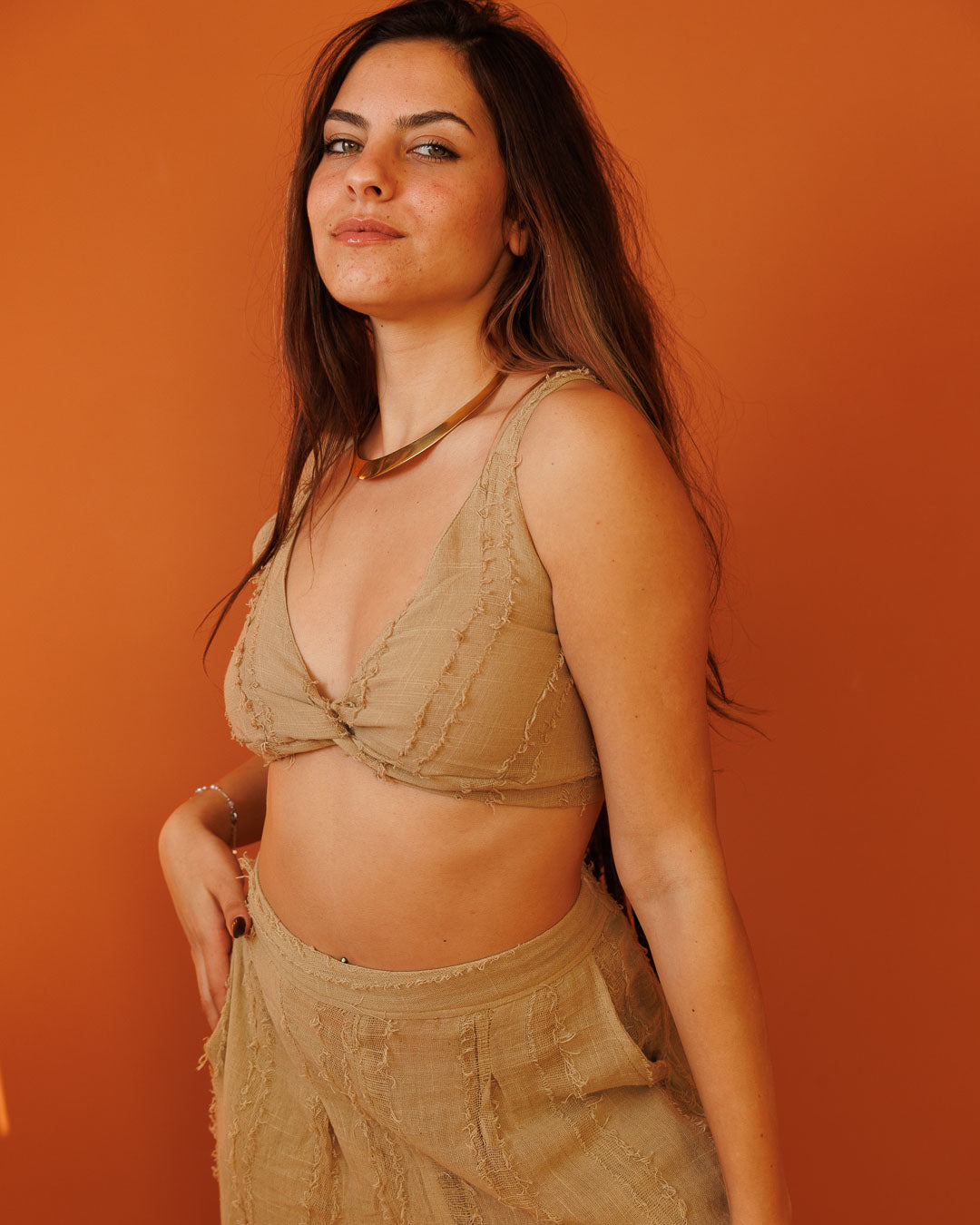 • טופ קשר מלפנים מכותנת פרנזים בגוון חאקי – בוהו נקי עם טוויסט מחמיא.