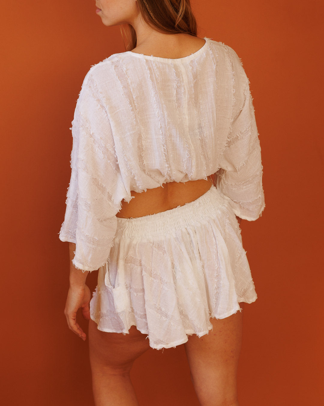 מכנס מטריה קצר בצבע לבן, עם נפילה קלילה ותנועה “מרחפת” שמרגישה כמו חצאית־מיני אבל נוחה כמו שורטס. הבד מגיע עם טקסטורת פרנזים טבעית ועדינה שמוסיפה עומק, עניין ואופי בוהו־פרימיום בכל זווית.