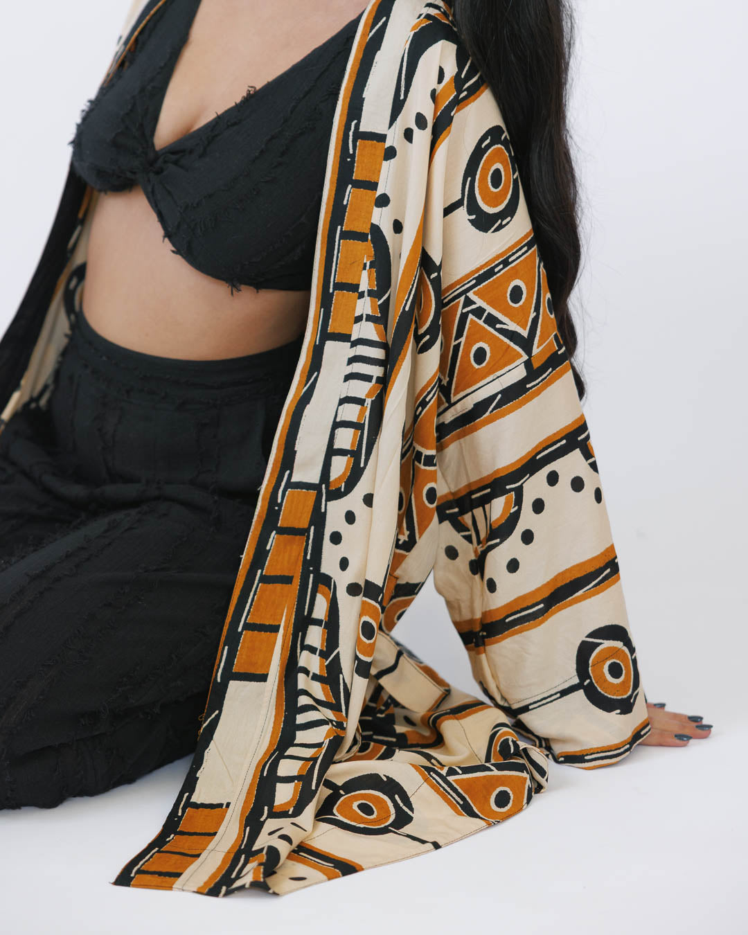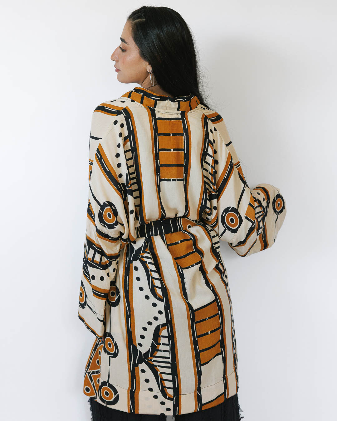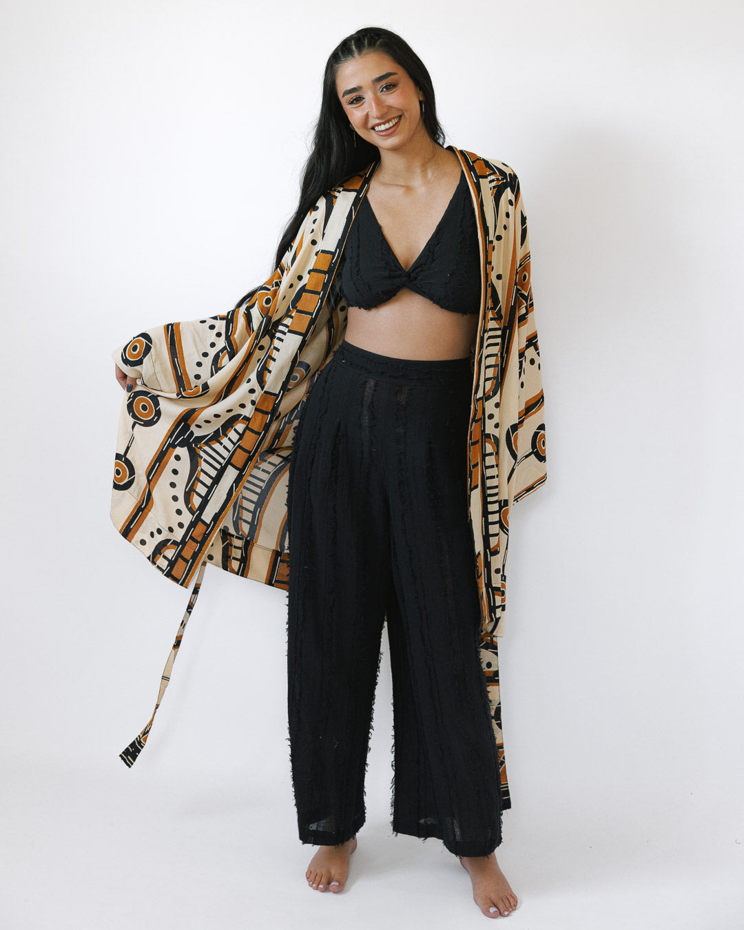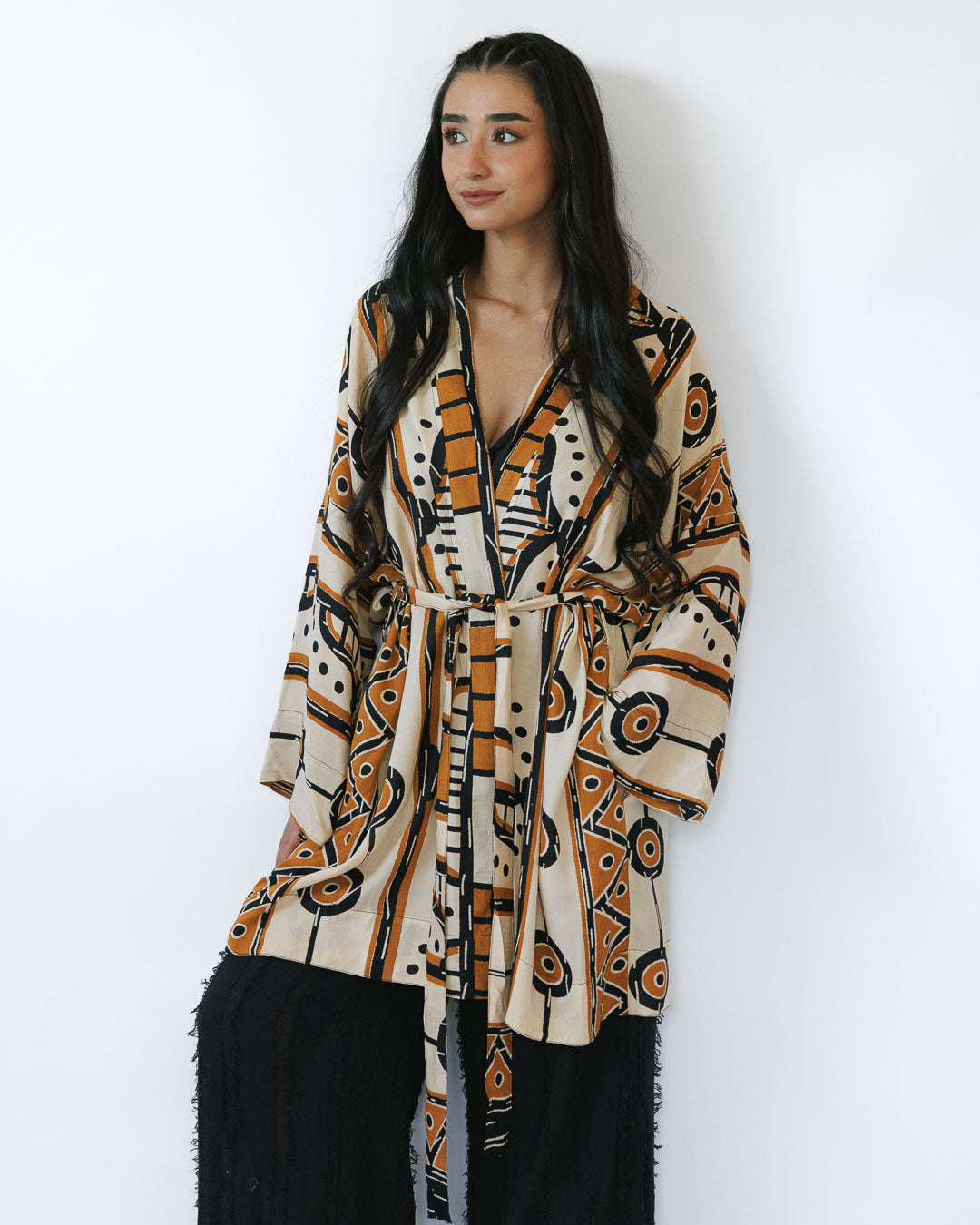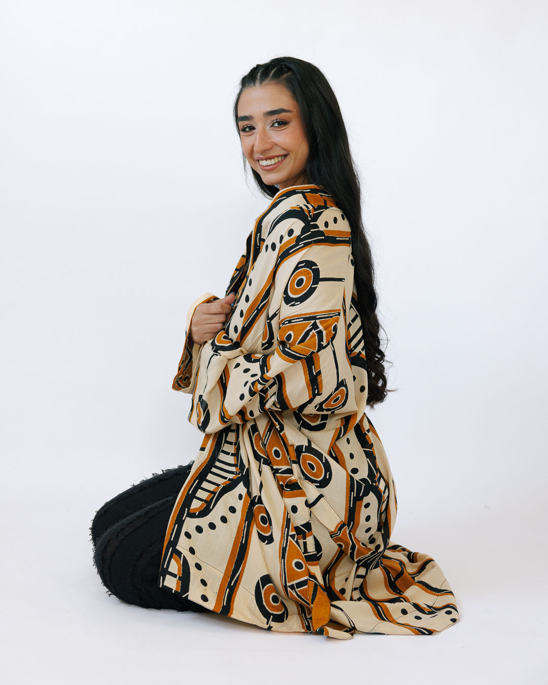 קימונו שחור־קאמל בהדפס גאומטרי: קימונו ארוך בגזרה חופשית עם נוכחות רגועה. שילוב של רקע בהיר/שמנתי עם הדפס גאומטרי בקווים שחורים ונגיעות קאמל־חמרה, שנותן וייב חם ומדויק בלי להיות “צועק”. נלבש פתוח ללוק זורם או קשור עם החגורה כשבא לך מראה יותר אסוף.
