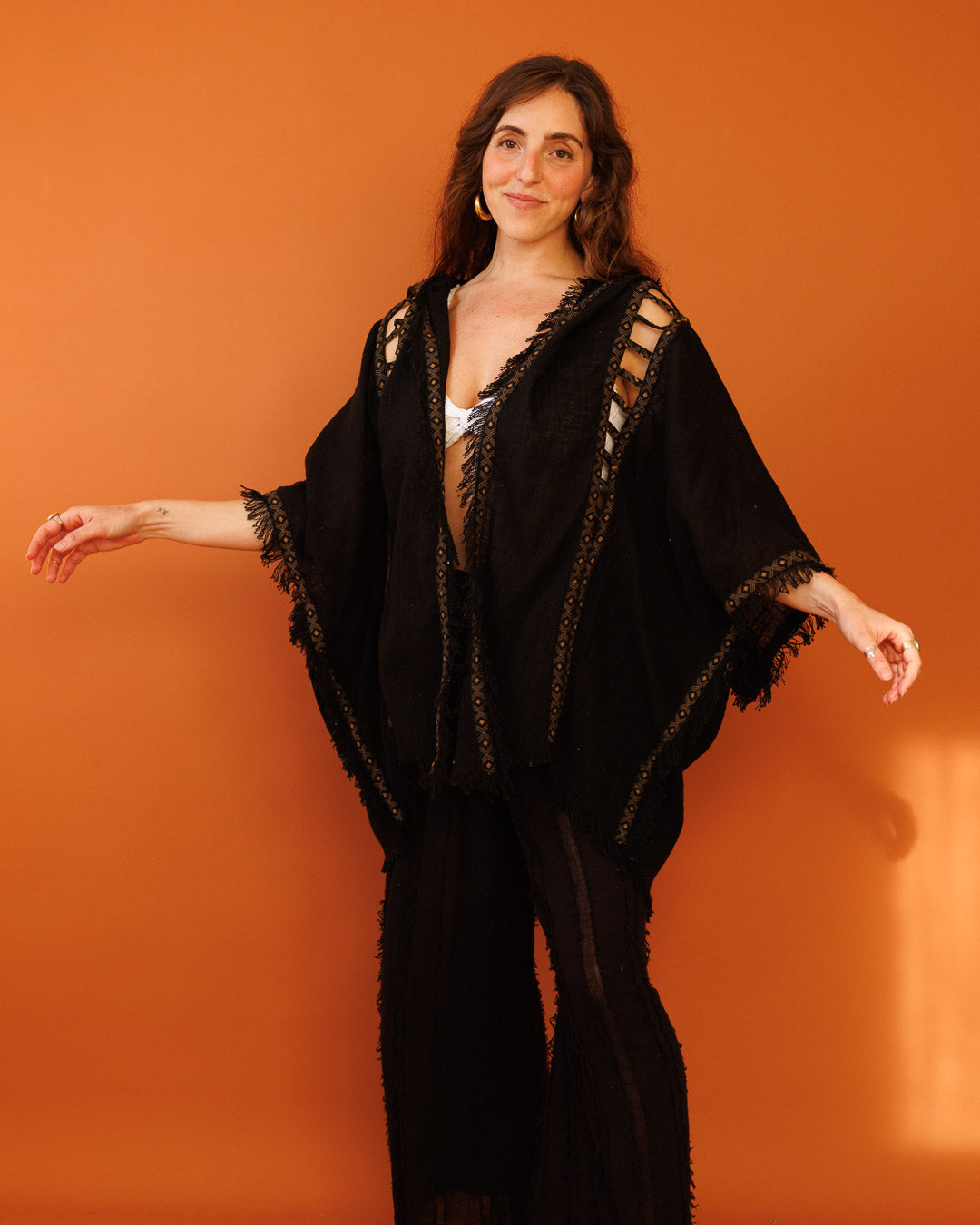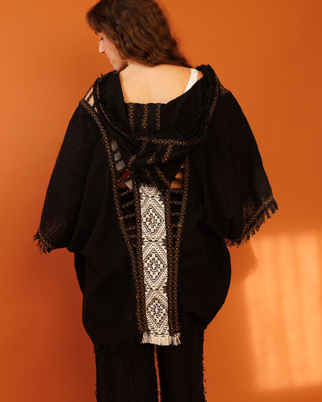 פונצ’ו פתוח מבד כותנה דק ועדין בצבע נטורל, עם קפוצ’ון ופרנזים שמכניסים וייב בוהו־רחוב. הבורדר השבטי השחור־לבן המנצנץ במרכז הגב נותן סטייטמנט חזק — מושלם לפסטיבלים וללוקים של ערב.