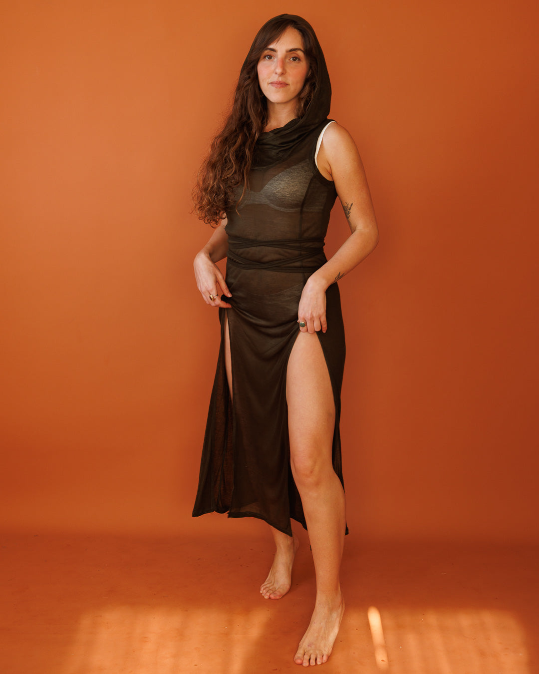 - השקיפות העדינה נותנת מראה חצוף־אלגנטי, והכובע+צווארון מוסיפים טוויסט דרמטי ומודרני.