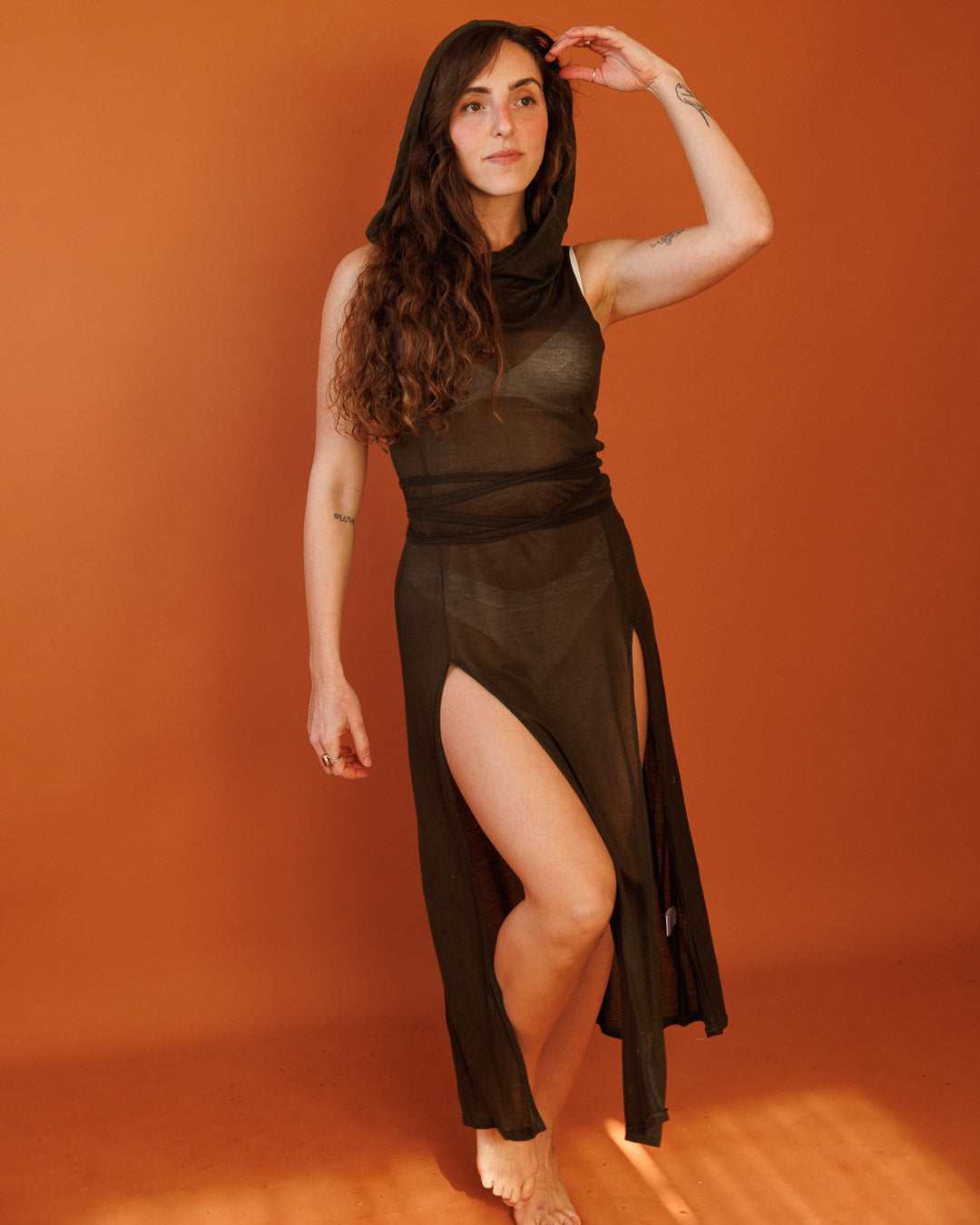 שמלת בוהו־נייט פרימיום שמכניסה דרמה שקטה — בד ויסקוז־לייקרה שקוף־מעט וסקסי שיושב צמוד ונשפך נכון, צווארון גבוה עם כובע שמוסיף וייב מסתורי, חגורה לקשירה בבטן שמפסלת את המותן, ושסעים גבוהים שמביאים תנועה בכל צעד. זו שמלה של “לצאת רגע” ולהרגיש בלתי ניתנת להתעלמות.