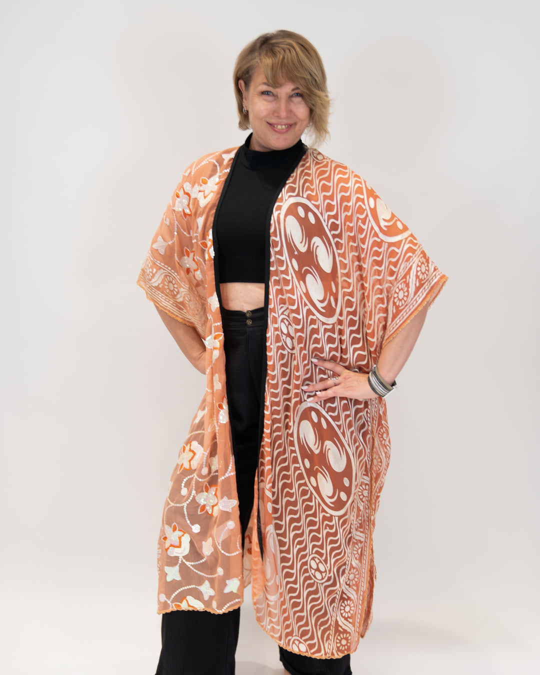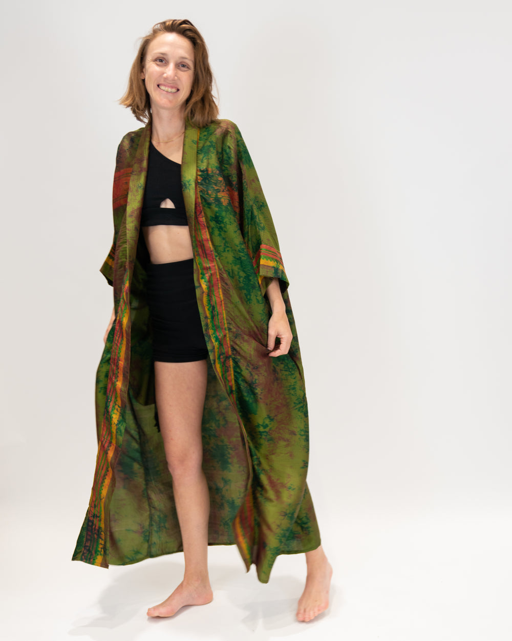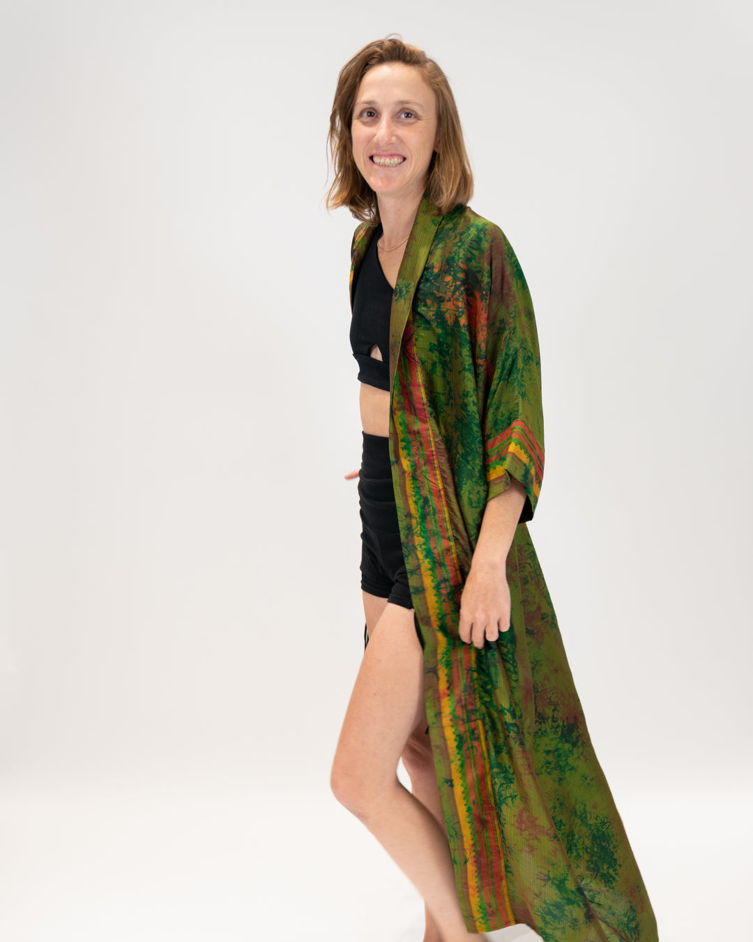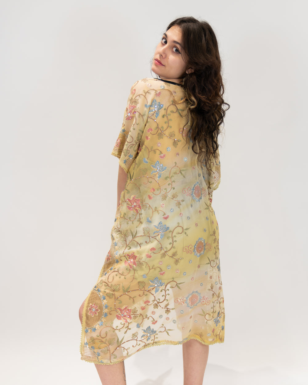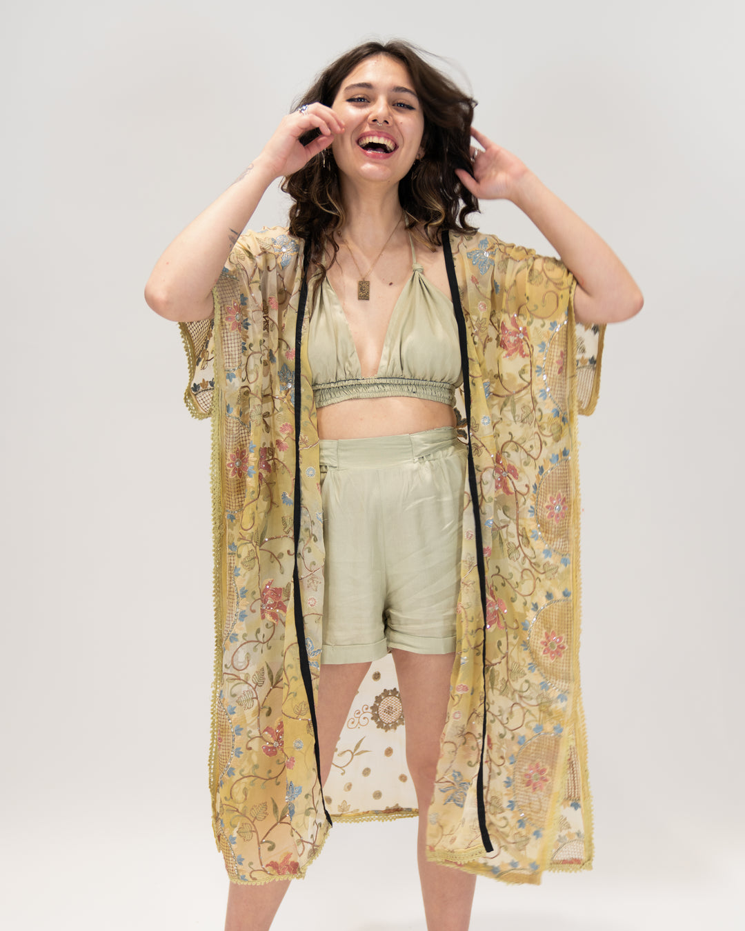 קימונו מקסי רקמה צהבהב-ירקרק נוצץ, יחיד מסוגו, שרוול קצר לאישה