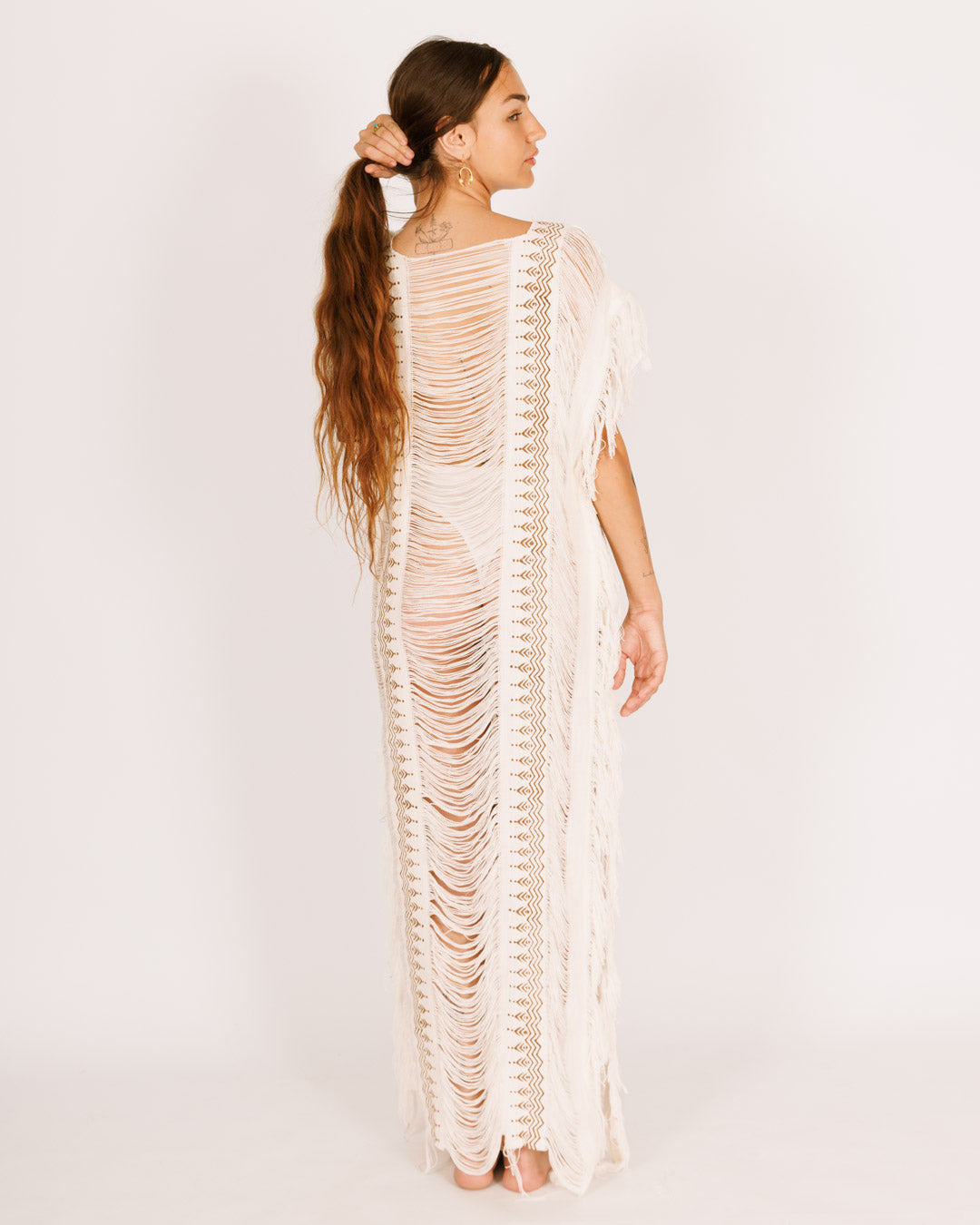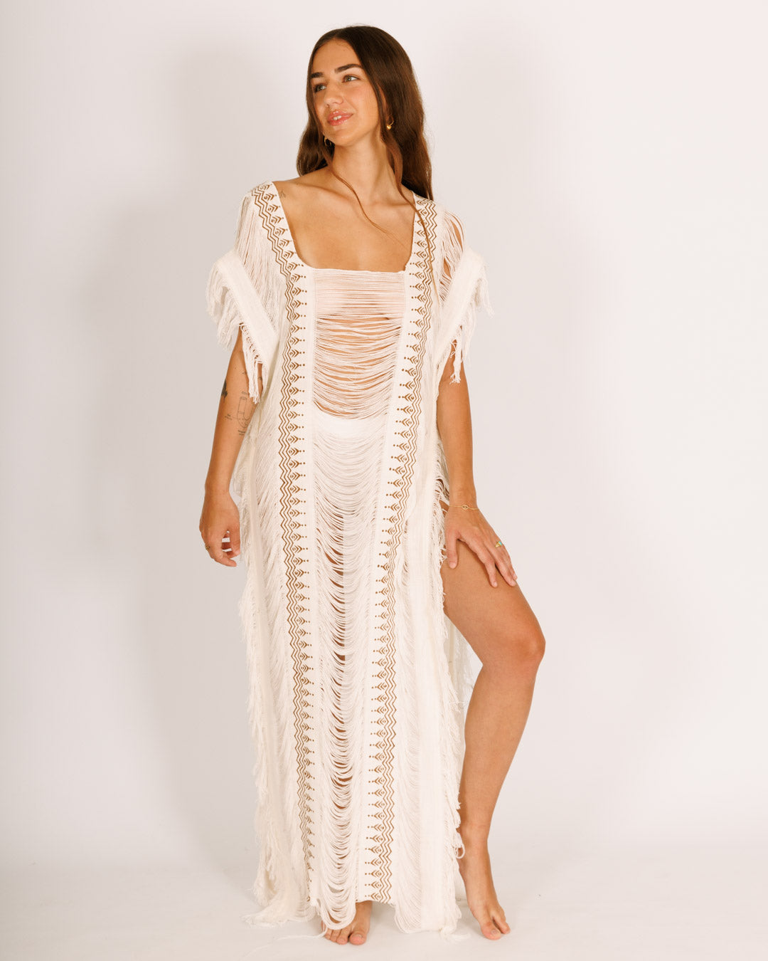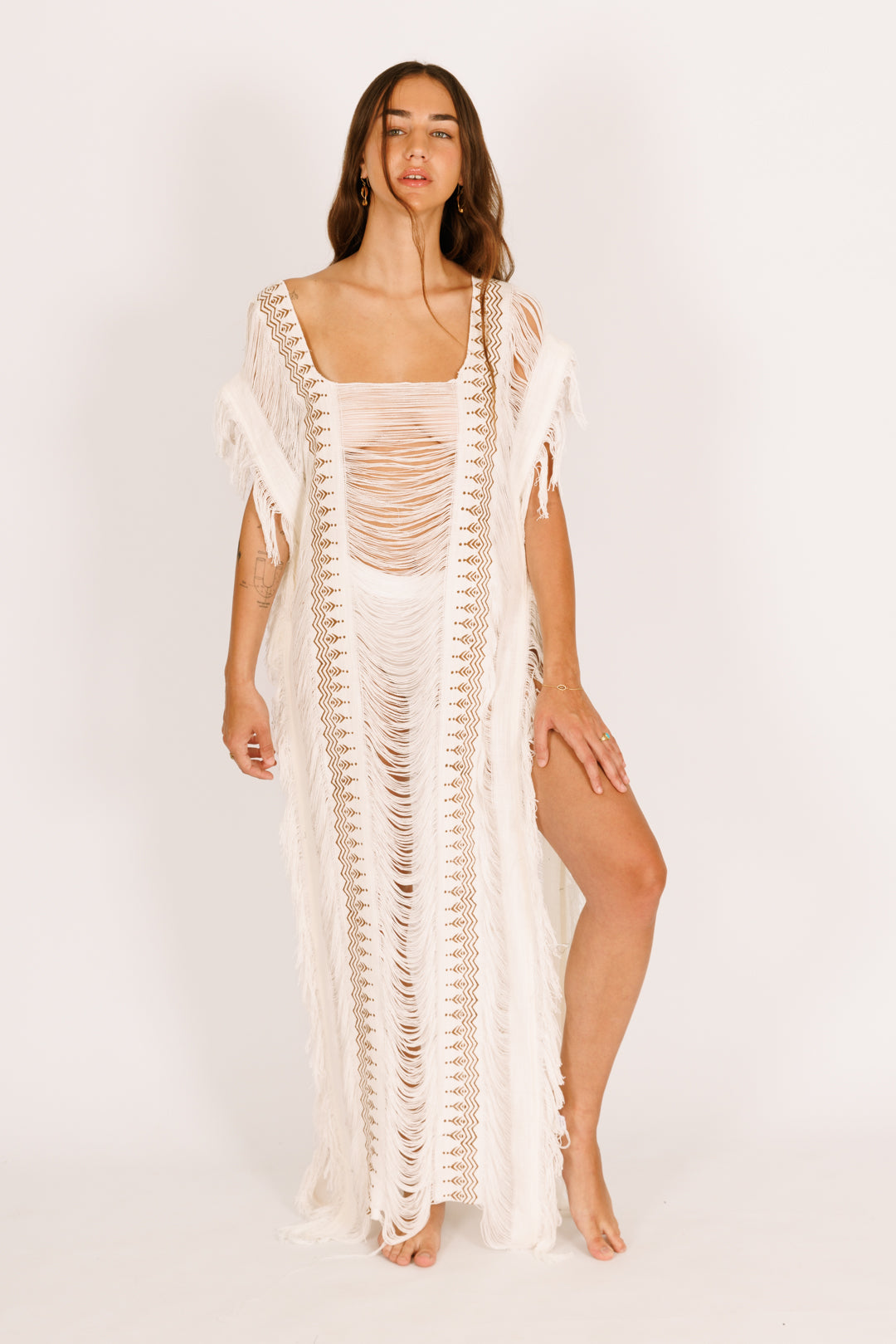 שמלת מקסי דרמטית וסקסית, מכותנה לבנה עם חותמות בלוק פרינט. במרכז השמלה מקדימה ומאחורה יש טור פרימת בד מגניב. שסעים צדדים גבוהים.