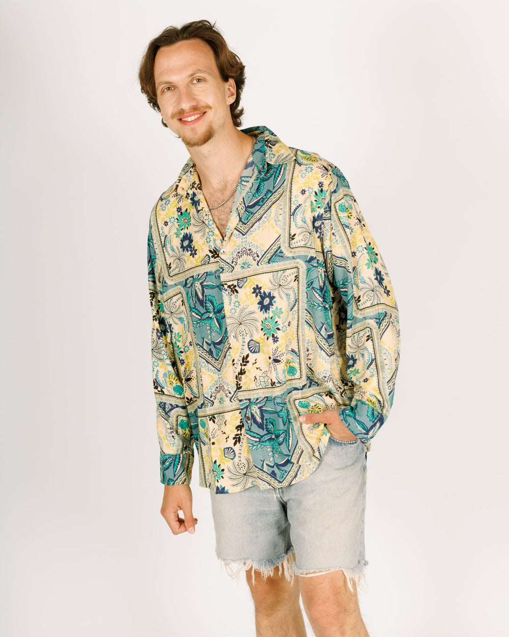 מכופתרת ארוכה ויסקוז לגבר - גאומטרי ירוק, תכלת ושמנת
